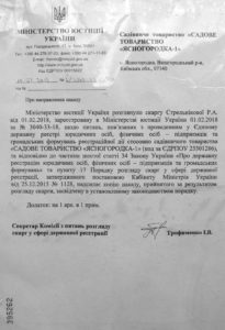 Міністерство юстиції України розглянуло скаргу Стрельнікової Р.А. від 01.02.2018, зареєстровану в Міністерстві юстиції України 01.02.2018 за № 3040-33-18, щодо питань, пов’язаних з проведенням у Єдиному державну реєстрі юридичних осіб, фізичних осіб – підприємців та громадських формувань реєстраційної дії стосовно садівничого товариства «САДОВЕ ТОВАРИСТВО «ЯСНОГОРОДКА-1» (код за ЄДРПОУ 25301286), та відповідно до частини шостої статті 34 Закону України «Про державну реєстрацію юридичних осіб, фізичних осіб – підприємців та громадських формувань» та пункту 17 Порядку розгляду скарг у сфері державної реєстрації, затвердженого постановою Кабінету Міністрів України від 25.12.2015 № 1128, надсилає копію наказу, прийнятого за результатом розгляду скарги, засвідчену в установленому законодавством порядку.