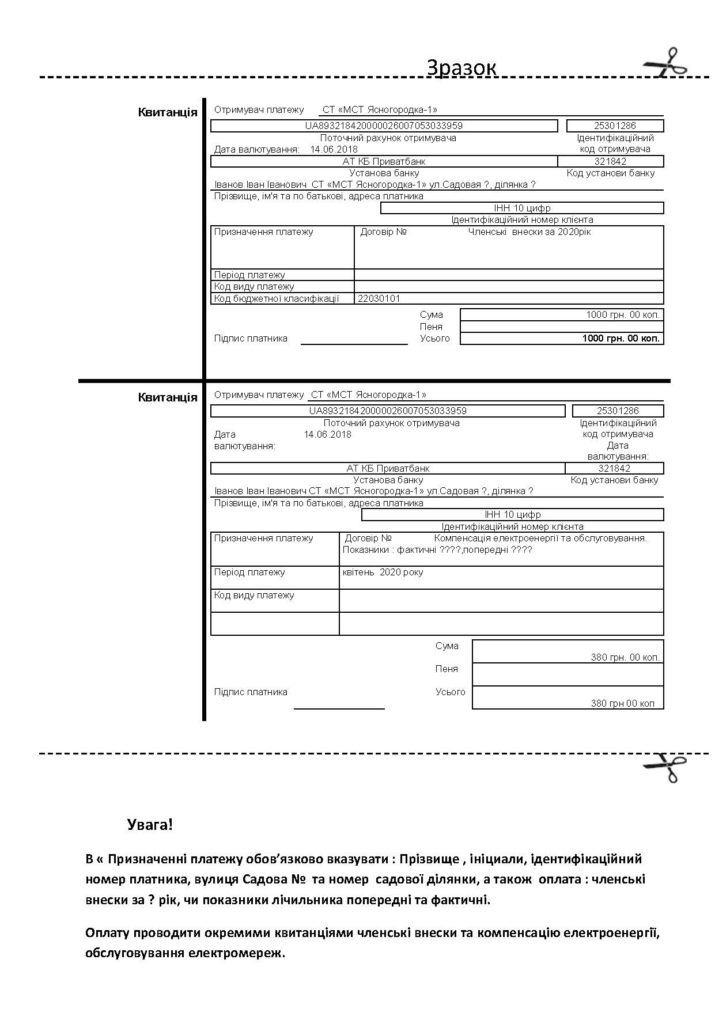 Обращаем ваше внимание, что в графе «Призначення платежу» обязательно необходимо указать за что вносится оплата (эксплуатационные взносы или электричество)! Помимо этого, ОБЯЗАТЕЛЬНО необходимо указать в назначении платежа вашу Фамилию и инициалы, а также название улицы и номер домика, для того чтобы бухгалтер смог идентифицировать от кого пришел платеж. Когда вы оплачиваете электроэнергию, обязательно необходимо указать предыдущие и текущие показания счётчика.