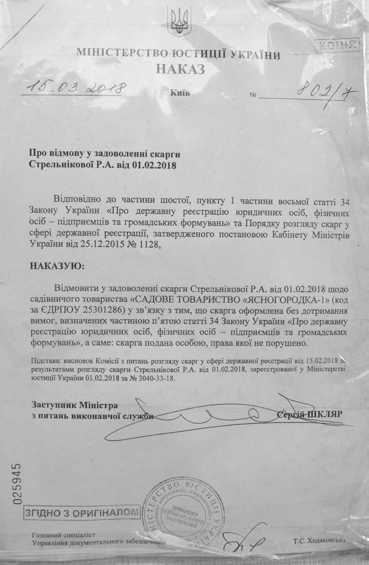Міністерство юстиції України розглянуло скаргу Стрельнікової Р.А. від 01.02.2018, зареєстровану в Міністерстві юстиції України 01.02.2018 за № 3040-33-18, щодо питань, пов’язаних з проведенням у Єдиному державну реєстрі юридичних осіб, фізичних осіб – підприємців та громадських формувань реєстраційної дії стосовно садівничого товариства «САДОВЕ ТОВАРИСТВО «ЯСНОГОРОДКА-1» (код за ЄДРПОУ 25301286), та відповідно до частини шостої статті 34 Закону України «Про державну реєстрацію юридичних осіб, фізичних осіб – підприємців та громадських формувань» та пункту 17 Порядку розгляду скарг у сфері державної реєстрації, затвердженого постановою Кабінету Міністрів України від 25.12.2015 № 1128, надсилає копію наказу, прийнятого за результатом розгляду скарги, засвідчену в установленому законодавством порядку.